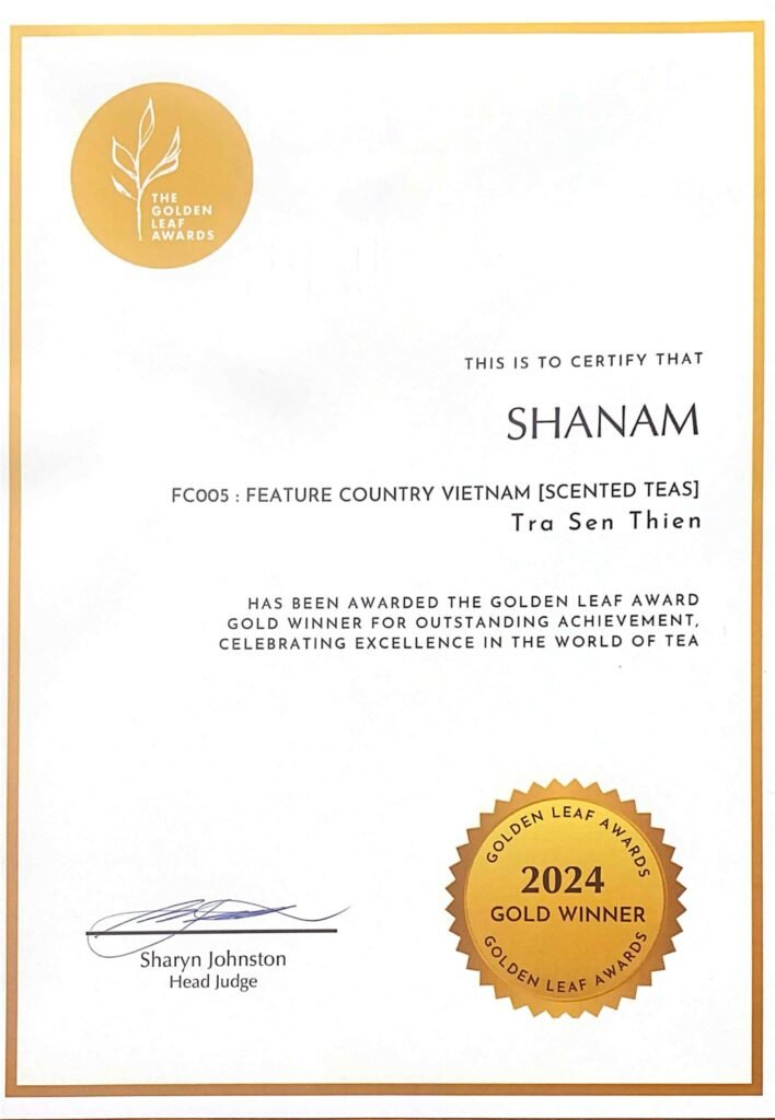 Trà Sen Thiện Shanam vinh dự nhận Giải Vàng, khẳng định sự kết hợp tinh tế giữa trà shan tuyết cổ thụ và hoa sen Việt Nam là hai sản phẩm hồn cốt của tinh túy ẩm thực Việt Nam đã chinh phục được những chuyên gia, những vị giám khảo khó tính nhất.